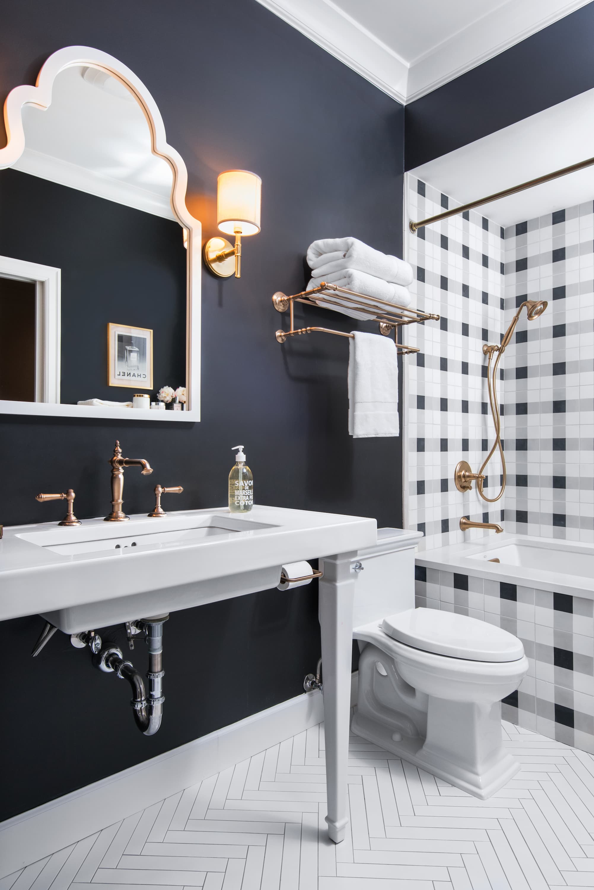 If you want to use bold colors in your bathroom, use large neutral tiles with narrow grout lines that won't distract from the focal point.